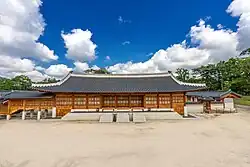 A complex used for funerary rites and as a temporary residence. It did not exist before the Imjin War;[147] it was first built in 1865.[51] It was used for the 1890 funeral of Queen Sinjeong and 1895 funeral of Empress Myeongseong.[148][51] During the colonial period, it was moved to Deoksugung, where it was later demolished.[51] The Capital Defense Command occupied its former spot until 1996.[149] It was restored in 2005.[150] Buildings in the complex include Yeongsajae (영사재; 永思齋; Yŏngsajae), Gongmukjae (공묵재; 恭默齋; Kongmukchae), and Sungmundang (숙문당; 肅聞堂; Sungmundang).[151]