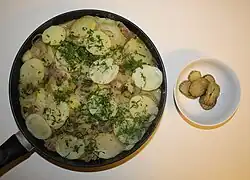 Potato salad International A dish made from boiled potatoes that comes in many versions in different regions of the world. Though called a salad, it is generally a side dish, as it usually accompanies the main course.
