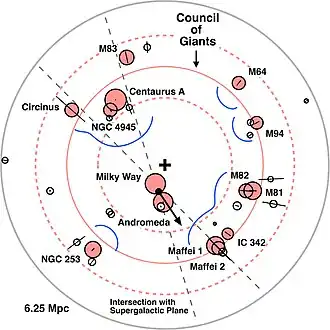 The so-called Council of Giants is a ring of twelve large galaxies surrounding the Local Group in the Local Sheet, with a radius of 3.75 Mpc (12.2 Mly).[4] Ten of these are spirals, while the remaining two are ellipticals. The two ellipticals (Maffei 1 and Centaurus A) lie on opposite sides of the Local Group.