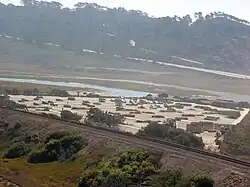 Until the late 19th century, the lagoon went inland for as much as 1.75 miles, its salt marshes, salt flats, and mud flats/open water occupied approximately 380 acres, with salt marshes constituting about 72% of the area.[10] The lagoon was almost separated from the ocean by the sand and dune barrier that was about 300 feet wide and up to 30 feet high. Few tidal channels merged into a single large channel at the northern part of the beach.[10] Historically, the mouth of the channel (inlet of the lagoon) was open and closed intermittently. A "high wall composed of small rocks" was located along the beach side of the lagoon (the route of the modern North Torrey Pines Road). This barrier was mined for cobbles that were used to pave the streets of San Diego.[11]