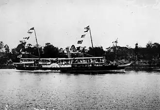 As well as servicing Queensland lighthouses, the steamer was used for ministerial visits along the coast (and to New Guinea on occasion), cabinet meetings on the Brisbane River and Moreton Bay, picnic outings for various associations and annual excursions for school children in the state. Lucinda was also flagship of the Royal Queensland Yacht Squadron, and she was referred to as Queensland Government Steam Yacht (QGSY) Lucinda.[2][6] Lucinda was used at one time as a mail vessel for delivering mail along the Queensland coast. At that time she was largely captained by Captain James Hodda South (serving with distinction from 17 November 1887 until his retirement with the rank of Commander on 1 May 1907) who notably surveyed/sounded and used South Passage in Moreton Bay to cut hours off the mail route. It was thought by some that this is how South Passage came to be named; however, the name had been given to this Southern Passage about 50 years earlier.[2]
