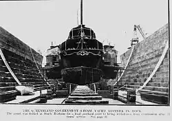 The Queensland Government ordered Lucinda from the Scottish shipyard of William Denny & Brothers at Dumbarton in January 1884 to replace an earlier steam yacht Kate from 1864. She was designed as a paddle yacht and lighthouse tender with a steel hull of 180 feet (55 m) length overall, 25 feet (7.6 m) beam and 9+12 feet (2.9 m) depth; the steamer measured 301 gross register tons and had a service draught of 6 feet 3 inches (1.91 m). Her two side paddles were powered by an oscillating two-cylinder compound engine of 114 nhp, made by Denny, and she was equipped with electric light. She had a female figurehead and her accommodation was well fitted out.[3] The press reported that "Although technically designated as only as lighthouse tender, the Lucinda is in reality one of the most magnificent upholstered and effectively equipped steamers afloat."[5] The forward saloon was fitted with sofas and could be converted to sleep 20 passengers, while the aft saloon was designed for social events. The specification notes that "an oval shaped deck opening in centre, with stained glass skylight, afforded light and ventilation" and that the "aft part of the deckhouse was fitted up as a ladies' ante-room, with side panels of japanese tapestry." There was also a smoking room in the forward deckhouse.[1][3]