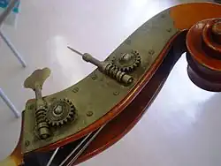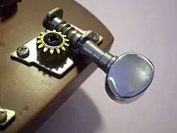 A machine head (also referred to as a tuning machine, tuner, or gear head) is a geared apparatus for tuning stringed musical instruments by adjusting string tension. Machine heads are used on mandolins, guitars, double basses, and others, and are usually located on the instrument's headstock. Other names for guitar tuners include pegs, gears, machines, cranks, knobs, tensioners, and tighteners.