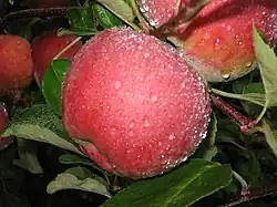 'Macoun' apples are a cross between the 'McIntosh' and 'Jersey Black' cultivars.[1] The Macoun ("Ma-cown," after the variety's namesake, Canadian horticulturalist W.T. Macoun, but sometimes also pronounced either "Ma-coon" or "McCowan") was developed at the New York State Agricultural Experiment Station in Geneva, by Richard Wellington. It was first introduced in 1932,[2] and is an eating apple. This apple is popular for making European style apple pies because it does not break down during cooking and remains firm. Macouns are also very popular at roadside stands and pick-your-own farms. Availability is generally October through November.[3]
