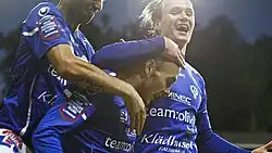Eriksson celebrates scoring against Norrköping while playing for Åtvidaberg.
