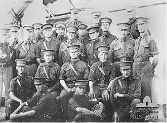- ^ Although the Australian War Memorial's card reference ([1]) claims that Robert Nimmo was a "Major"; no doubt due to the single "thing" on his shoulder, which was, obviously, thought to be a "crown", rather than what it must have been: a "bath star" or "pip" (see British Army officer rank insignia). Nimmo's service record ([2], page 27) clearly shows that he was a (two "pip") Lieutenant at the time of the photograph. Perhaps Nimmo had borrowed a shirt from a (one "pip") Second Lieutenant for the photograph.
