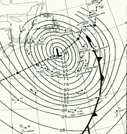 A surface weather analysis of the storm when near its peak intensity on the morning of March 8, 1969