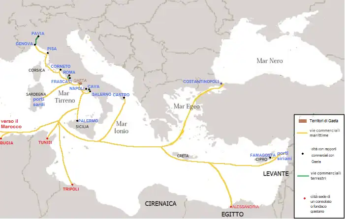 The economic recovery that took place in Europe starting with the 9th century, combined with hazardous mainland trading routes, enabled the development of major commercial routes along the Mediterranean coast. The growing autonomy acquired by some coastal cities gave them a leading role in this development. As many as six of these cities — Amalfi, Venice, Gaeta, Genoa, Ancona, and Ragusa — began their own history of autonomy and trade after being almost destroyed by terrible looting, or were founded by refugees from devastated lands.[10] These cities, exposed to pirate raids and neglected by central powers, organized their own defence autonomously, coupling the exercise of maritime trade with that of their armed protection. Thus, in the 9th, 10th, and 11th centuries, they were able to go on the offensive, obtaining numerous victories over the Saracens, starting with the historic Battle of Ostia in 849. The traffic of these cities reached Africa and Asia, effectively inserting itself between the Byzantine and Islamic maritime powers, with which a complex relationship of competition and collaboration was established for the control of the Mediterranean routes.[8]