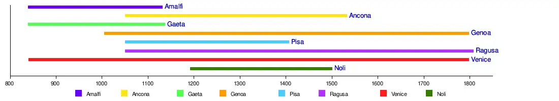 The table below shows the periods of activity of the various maritime republics over the centuries.