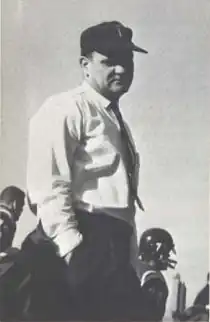 Jim Tatum was hired in 1947, after a brief stint at Oklahoma where he had led the Sooners to a conference championship in his only season there.[12] He was Maryland's sixth head coach in eight years, but Tatum stayed for nine seasons and became the school's most successful head coach in modern history.[13] During his tenure, he led Maryland to two national championships (one retroactive),[4] three conference championships, three perfect seasons, six top-20 final rankings, and five bowl game appearances.[9] Seven of his players were named first-team All-Americans, including five consensus All-Americans. Under Tatum, Maryland finished every season with a winning record.[9]