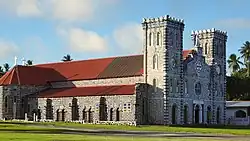Downtown Mata-Utu is dominated by the Matâ'Utu Cathedral, a French national monument, which bears the royal insignia of Wallis, a Maltese cross between its towers.[13] The cathedral is also known as "Our Lady of Good Hope Cathedral", which overlooks the lagoon. Within its vicinity there are, as well as several restaurants, the Au Bon Marche and Oceania market, hotels and the post office, and the simple Palace of the King of Uvéa, which features two-storey verandas adjoining the church.[3][6]