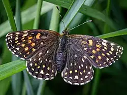 Melitaea diamina has a wingspan of 36–42 mm. Females are larger than males.[5][6] This medium-sized species is highly variable in extent of black markings and in the diversification of ground colour on the upperside of the wings. The upper side of the wings usually is black brown, with yellowish-orange ground colour and white chequered fringe. On the upperside of the hindwings there are very heavy dark markings. Sometimes it may be uniformly dark brown. The underside of the hindwings shows a submarginal series of white half moons and a few bands of creamy-white and orange checkers.[4][7]