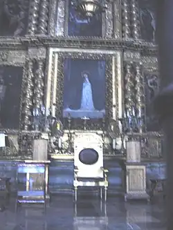 Additional sculptures were created by Sebastián de Santiago.[34] It takes its name from the statues of saintly royalty which form part of its decoration,[3] and is the oldest work in churrigueresque style in Mexico, taking 19 years to complete. At the bottom, from left to right, are six female royal saints: Saint Margaret of Scotland, Helena of Constantinople, Elisabeth of Hungary, Elizabeth of Aragon, Empress Cunegunda and Edith of Wilton.[35] In the middle of the altar are six canonized kings: Hermenegild, a Visigoth martyr; Henry II, Holy Roman Emperor; Edward the Confessor; and Casimir of Poland below, and Saints Louis of France and Ferdinand III of Castile above them. In between these kings an oil painting of the Adoration of the Magi by Juan Rodriguez Juarez shows Jesus as the King of kings. The top portion features a painting of the Assumption of Mary as celestial queen flanked by oval bas reliefs, one of Saint Joseph carrying the infant Jesus and the other of Saint Teresa of Ávila with a quill in her hand and the Holy Spirit above her, inspiring her to write.[36] In the upper part above this, there are angels carrying the attributes of the Virgin Mary such as the Sealed Fountain, the House of Gold, the Well of Living Water, and the Tower of David, and at the top is an image of God, the Father.[31]
