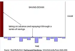 Rutherford argues that the basic problem that poor people face as money managers is to gather a "usefully large" amount of money. Building a new home may involve saving and protecting diverse building materials for years until enough are available to proceed with construction. Children's schooling may be funded by buying chickens and raising them for sale as needed for expenses, uniforms, bribes, etc. Because all the value is accumulated before it is needed, this money management strategy is referred to as "saving up".[15]