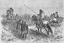 All farari, like the ton-tigui of Sundjata's generation, were accompanied by jonow who followed on foot and cared for their master's horses.[32] These jonow were known as sofas, and they would have supplied their ton-tigui with extra javelins in the middle of battle or guarded his getaway horse if retreat was necessary.[33] In fact, the word sofa translates as "horse father" meaning guardian of the horse.[34]