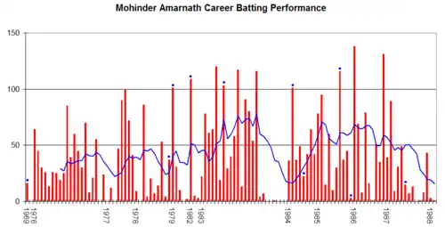 Mohinder Amarnath played 69 Tests scoring 4,378 runs at a batting average of 42.50, with 11 hundreds and 24 fifties, and claimed 32 wickets at a bowling average of 55.68 apiece. In 85 One Day Internationals, he scored 1,924 runs at an average of 30.53 and a highest score of 102 n.o. and claimed 46 wickets at 42.84 apiece.[9]