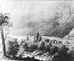 View of the church (1665-1841) and priest's farm (drawn in 1829)