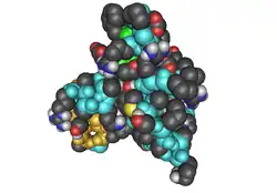 - Spacefilling models or CPK models (also an atomic coloring scheme in representations) – the molecule is represented by overlapping spheres representing the atoms.
