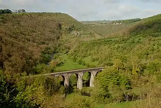 The Headstone Viaduct was built by the Midland Railway over the River Wye. The bridge, which stands near the 533-yard (487 m) Headstone Tunnel, is 300 feet (91 m) long. It had five 50-foot (15 m) span arches, some 70 feet (21 m) high at the centre.[1][2] Initially, some slippage occurred, and remedial work was carried out in 1907–08.[3]