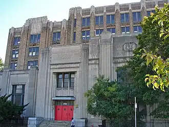Murrell Dobbins Career & Technical Education High School, also known as Murrell Dobbins Vocational High School, is a historic vocational school building located in the West Lehigh neighborhood of North Philadelphia, Pennsylvania, United States. It is part of the School District of Philadelphia. The building was designed by Irwin T. Catharine and built between 1936–1937. It is a six- to seven-story, 14-bay, brick building in the Moderne-style. It has a one-story, stone front building. It features brick piers with terracotta tops and the building has terra cotta trim.[2]