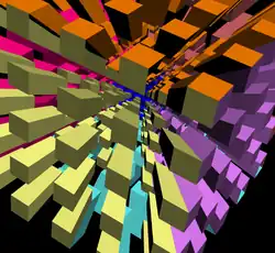 Another alternate-dimension puzzle is a view achievable in David Vanderschel's Magic Cube 3D. A 4-cube projected on to a 2D computer screen is an example of a general type of an n-dimensional puzzle projected on to a (n – 2)-dimensional space. The 3D analogue of this is to project the cube on to a 1-dimensional representation, which is what Vanderschel's program is capable of doing.