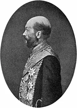 Nabokov was born on 22 April 1899 (10 April 1899 Old Style) in Saint Petersburg[c] to a wealthy and prominent family of the Russian nobility. His family traced its roots to the 14th-century Tatar prince Nabok Murza, who entered into the service of the Tsars, and from whom the family name is derived.[11][12]: 16 [13] His father was Vladimir Dmitrievich Nabokov, a liberal lawyer, statesman, and journalist, and his mother was the heiress Yelena Ivanovna née Rukavishnikova, the granddaughter of a millionaire gold-mine owner. His father was a leader of the pre-Revolutionary liberal Constitutional Democratic Party, and wrote numerous books and articles about criminal law and politics.[14] His cousins included the composer Nicolas Nabokov. His paternal grandfather, Dmitry Nabokov, was Russia's Justice Minister during the reign of Alexander II. His paternal grandmother was the Baltic German Baroness Maria von Korff. Through his father, he was a descendant of the composer Carl Heinrich Graun.[15]