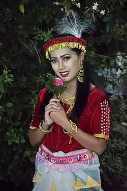 Nachom (Meitei: ꯅꯥꯆꯣꯝ, lit.'ear sprout'), also known as nachomlei (ꯅꯥꯆꯣꯝꯂꯩ) or lei nachom (Meitei: ꯂꯩ ꯅꯥꯆꯣꯝ, lit.'flower ear sprout'),[1][2][2]: 102 [2]: 178  is a traditional small bouquet or posy worn by Meitei women in Manipur, a state in Northeast India. It holds cultural, religious, and romantic significance in Meitei civilization and continues to be a part of rituals, festivals, and traditional attire.[3][4][5]