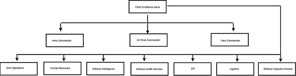 NDF ranks are based on the Commonwealth rank structure. There is no approved four-star general rank in the NDF. The Chief of Defence Force is a singular appointment that comes with an elevation to the rank of lieutenant general for an Army officer, air marshal for an Air Force officer and vice admiral for a Navy officer. Arms of services commanders i.e. Army, Air Force and Navy commanders, have the rank of major general, air vice marshal and rear admiral. The rank of brigadier has also been transformed into brigadier general. Directorate heads are always brigadier generals, i.e. the Chief of Staff for Defence Intelligence.