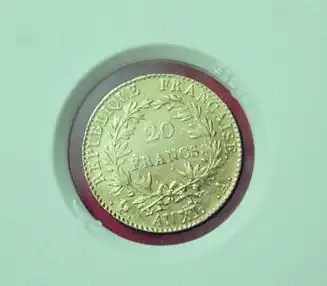 The Napoléon is the colloquial term for a former French gold coin. The coins were minted (at various times) in denominations of 5,[1] 10,[2] 20,[3] 40,[4] 50,[5] and 100[6] francs. This article focuses on the 20 franc coins issued during the reign of Napoléon Bonaparte, which are 21 mm in diameter, weigh 6.45 grams (gross weight) and, at 90% pure, contain 0.1867 troy ounces (5.807 g) of pure gold. The coin was issued during the reign of Napoleon I and features his portrait on the obverse. The denomination (known as the Franc Germinal) continued in use through the 19th century and later French gold coins in the same denomination were generally referred to as "Napoléons". Earlier French gold coins are referred to as Louis (the name of eighteen French kings) or écu (an old French word for shield). Gold Napoléons have historically proven more resilient than other gold coins to economic forces, such as after the Suez crisis when unlike other coins Napoléons did not weaken.[7]