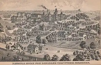 The National Asylum for Disabled Volunteer Soldiers was established on March 3, 1865, in the United States by Congress to provide care for volunteer soldiers who had been disabled through loss of limb, wounds, disease, or injury during service in the Union forces in the American Civil War. Initially, the Asylum, later called the Home, was planned to have three branches: in the Northeast, in the central area north of the Ohio River, and in what was then considered the Northwest, the present upper Midwest.