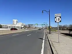Route 18 is a 47.92-mile-long (77.12 km) state highway in the central part of the US state of New Jersey. It begins at an intersection with Route 138 in Wall Township, Monmouth County, and ends at Interstate 287 (I-287) in Piscataway, Middlesex County. Route 18 is a major route through Central New Jersey that connects the Jersey Shore to the Raritan Valley region, connecting the seats of Monmouth County (Freehold) and Middlesex County (New Brunswick) respectively. The route runs through Ocean Township, Marlboro, East Brunswick, and is the main thoroughfare for Rutgers University. Much of the route is a freeway (including the entire portion in Monmouth County and much of the northern end through New Brunswick and Piscataway). The remainder of the route is an arterial road with traffic lights in the East Brunswick and Old Bridge areas, and a boulevard in the remainder of Piscataway. Route 18 was designated in 1939 as a proposed freeway from Old Bridge to Eatontown.[2] The section west of Old Bridge was formerly designated as part Route S28, a prefixed spur of State Highway Route 28 from Middlesex to Matawan. The designation, assigned in the 1927 renumbering, remained until a second renumbering in 1953. At that point, Route S28 was redesignated as Route 18, though the section from Old Bridge to Matawan was signed as TEMP 18, as this section would be decommissioned when the Route 18 freeway was built.
