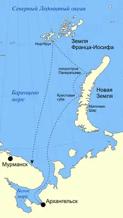 The "Malygin" left Arkhangelsk on July 19, 1931, and in the evening of July 23 it reached Newton Island in the Franz Josef Land archipelago, where the first bear hunt was organized. Before that, the ship passed through a thin ice field more than 100 miles wide, which presented no difficulties. On the way to Cape Flora, the "Malygin" ran aground, but managed to free itself without damage. At least 125 icebergs of various sizes were grounded on the same shallow shore. On July 24, a 9-point storm broke out, which prevented us from landing at Cape Flora. On July 27 there was a meeting with the airship "Graf Zeppelin" in Tikhoi Bay. The participants of the meeting exchanged mail, but the Soviet side did not receive the data of aerial photography under the pretext that the films were exposed (according to I. Papanin, these data were received by the German military intelligence).[87] A polar bear hunt was organized to entertain the passengers. Landing at Cape Flora was not possible until July 31. In early August, they approached Jackson Island, where tried to find Nansen's winter camp, but without success. Then they went to Rudolf Island, but due to heavy fog from August 2 to 4, the "Malygin" drifted in fields of solid ice. Only on August 5th they reached the Teplitz Bay full of broken ice, where they found the camp of the Fiala expedition, from which various relics and equipment were taken for the Arctic Museum. On August 7, near the southwestern part of Karl-Alexander Island, the Pontremoli Ridge was discovered – three small islands named after the Italian scientist who died in the crash of the airship "Italy". It was impossible to enter the Strait of Austria, so "Malygin" moved to the British Channel to check the existence of Harmsworth Island. It turned out that instead of the two islands shown on Jackson's map, there was a single landmass covered with an ice dome and named Arthur. Ice conditions did not allow exploration of the north coast of Alexandra Land in search of the remains of the "Italy". On August 8, the crew visited Alger Island, where the hut of the 1901–1902 Baldwin expedition was found. The next day, the steamer set sail for the Barents Sea. As the coal was running out and the weather was very foggy, Captain D. Chertkov refused to call at Uyedineniya Island. On August 12, the passengers landed in Andromeda Bay on Novaya Zemlya, where a reindeer hunt was organized. A total of 11 bears and 6 reindeer were harvested during the trek.[88] On August 15, they visited the Polar Geophysical Observatory at Matochkin Strait, and on August 20, the "Malygin" returned safely to Arkhangelsk. According to V. Wiese, the temperature of the surface layer of the sea was measured at 295 points, water samples were taken for analysis of chlorine content at 273 points, and samples for pH determination were taken at 138 points. Meteorological observations were made every 4 hours.[89]