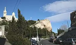 The rocky outcrop upon which the basilica would be built is an Urgonian limestone, peak dating from the Barremian and rising to a height of 162 metres (531 ft) above sea level.[2] Its height and proximity to the coast caused the hill to become an important stronghold and lookout point and a landmark for sailing. In 1302, Charles II of Anjou ordered one of his ministers to set beacons along the Mediterranean coast of Provence. One of the beacon sites was the hill of Notre-Dame de la Garde.[3]