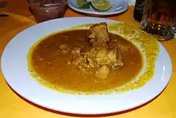 The name, colour, and ingredients distinguish the seven main moles of Oaxaca, called negro (black), amarillo (yellow), coloradito (little red or red-coloured), mancha manteles (tablecloth stainer), chichilo (named after the main pepper), rojo (red), and verde (green).[14] All of the moles, except for verde, can be kept as a paste and cooked later, diluted with chicken broth.[2] Mole negro is the best known and most complicated of the preparations, containing anywhere from twenty to thirty-plus ingredients, depending on the recipe.[2][13] Mole negro is slightly sweet, black in colour, and contains six different types of chili peppers, plantains, onion, tomatoes, tomatillos, cloves, cinnamon, chocolate, nuts, tortillas, avocado leaves, and more depending on the recipe. To gain the desired black colour, the chili peppers have to be well toasted but not burnt. Mole amarillo contains green tomatoes, onion, garlic, cumin, cloves, ancho chili peppers, guajillo chili peppers, and hoja santa or cilantro, and is garnished with onions, lime, and oregano. Mole coloradito is brick-red in colour and contains ancho chili peppers, tomatoes, garlic, sesame seeds, almonds, cinnamon, and oregano. Mancha manteles is red and uses ancho chili peppers, tomatoes, garlic, onion, thyme, cloves, and almonds. Another red mole is chichilo, which uses chihuacle, negro, pasilla, and mulato chile peppers, tomatoes, marjoram, allspice, cloves, and avocado leaves. Rojo is red, as its name suggests, with ingredients such as chocolate, guajillo chili peppers, onion, tomatoes, garlic, oregano, nuts, and sesame seeds. Mole verde contains tomatillos, green chili peppers, onion, garlic, cumin, cloves, ancho, and guajillo chili peppers, hoja santa, epazote, and parsley. It has a light and herby taste.[2][14] Of the sauces, verde is the easiest to create, as it does not require the toasting and rehydration of chili peppers.[14]
