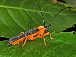 Oberea pupillata measures between 13 and 18 mm (0.51 and 0.71 in).[4] These beetles have a long and slender body. Head, thorax and abdomen have all about same width, and elytra are not tapered. Head and antennae are black and antennae are shorter than body. Pronotum is orange with two elongated black spots on the sides. The elytra are mostly blackish, yellowish at the base and rather hairy. The body is orange, with black markings on the sides and below the abdomen. The last abdominal segment shows a black mark. The legs are orange.
