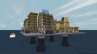 Ocean colonization as ocean settlement, or seasteading, being the extending of human settlement to the ocean, has been identified as settler colonial "tech-colonialism" at sea.[5] Such settlements have been suggested to be established with floating accommodation platforms, such as very large cruise ships or artificial islands, establishing seasteads, or with underwater habitats, employing offshore construction,[6] with arguments for floating structures, as they are generally less impacted by natural disasters.[7] Ocean settlement with the construction of artificial structures in aquatic environments though can also be disruptive to natural marine ecosystems.[8]