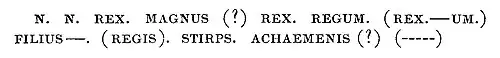 Grotefend made further guesses about the remaining words in the inscriptions, and endeavoured to rebuild probable sentences. Again relying on deductions only, and without knowing the actual script or language, Grotefend guessed a complete translation of the Xerxes inscription (Niebuhr inscription 2): "Xerxes the strong King, King of Kings, son of Darius the King, ruler of the world" ("Xerxes Rex fortis, Rex regum, Darii Regis Filius, orbis rector"). In effect, he achieved a fairly close translation, as the modern translation is: "Xerxes the Great King, King of Kings, son of Darius the King, an Achaemenian".[15]