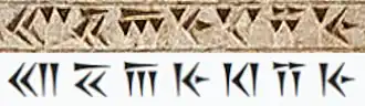 Most scholars consider the writing system to be an independent invention because it has no obvious connections with other writing systems at the time, such as Elamite, Akkadian, Hurrian, and Hittite cuneiforms.[26] While Old Persian's basic strokes are similar to those found in cuneiform scripts, Old Persian texts were engraved on hard materials, so the engravers had to make cuts that imitated the forms easily made on clay tablets.[7] The signs are composed of horizontal, vertical, and angled wedges. There are four basic components and new signs are created by adding wedges to these basic components.[27] These four basic components are two parallel wedges without angle, three parallel wedges without angle, one wedge without angle and an angled wedge, and two angled wedges.[27] The script is written from left to right.[28]