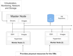 The worker nodes, or hypervisor enabled-hosts, provide the actual computing resources needed for processing all jobs submitted by the master node. OpenNebula hypervisor enabled-hosts use a virtualization hypervisor such as Vmware, Xen, or KVM. The KVM hypervisor is natively supported and used by default. Virtualization hosts are the physical machines that run the virtual machines and various platforms can be used with OpenNebula. A Virtualization Subsystem interacts with these hosts to take the actions needed by the master node.