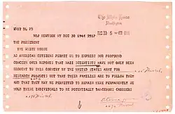First page of a transcription of a protest telegram about Operation Paperclip sent to Harry S. Truman by the Council Against Intolerance In America, endorsed by several signatories, including Albert Einstein, on December 30, 1946