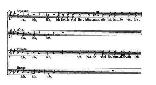 Fourth movement. The last movement of Op.3, No.11 is composed in ritornello ABA form. In the opening bars the first and second violins play in tutti the opening theme with its repeated quavers and clashing dissonances. Bach used the same theme for the opening chorus of his cantata Ich hatte viel Bekümmernis, BWV 21, first performed on 17 June 1714, shortly before ill health forced Prince Johann Ernst to leave Weimar for treatment in Bad Schwalbach.