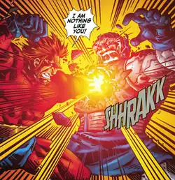 Orion belongs to an extraterrestrial race of supernatural immortals known as the New Gods. As a New God, he possesses the standard superhuman attributes of strength, speed, stamina and durability on par with his father Darkseid as well as with Superman; being virtually indestructible, able to run at supersonic speeds up to orbital speed, and lift weights exceeding 100 tons.[26] Although he is a highly skilled warrior, noted for a fierce warrior's instinct,[27] his great rage and inner turmoil makes him impulsive and prone to violent, almost psychotic outbursts as he has inherited much of his father's darkness.[28] He has access to a Mother Box that can calm his temper and change his appearance, "smoothing" out his coarse features.[27] In addition, Orion possesses a regenerative healing factor, and is able to call upon his Mother Box to assist in healing injuries or to sustain his life energies. Like all other New Gods, Orion is vulnerable to a substance called Radion. The "Astro-Harness" is an alien artifact of unknown origin, capable of self-repair; flight at light speed;[28] interstellar teleportation;[27] energy projection and absorption; force field generation; and possesses a tractor beam. Orion's wristbands are virtually indestructible.[29]