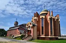 Osiedle Słoneczne is a housing estate consists of 5- and 13-storey-tall apparent buildings.[1][2] At Jasna Street, it features the Ruby Pond, and the Independence Memorial, a stainless steel sculpture, represented the past, presence, and future of Poland.[7][8] At 61 Rydla Street is also located the Our Lady of Fátima Sanctuary, a Catholic parish church.[5]
