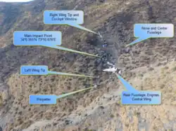 The aircraft finally reached a dangerously low speed and the stall warning sounded again inside the cockpit. At 850 feet (259 m) above ground, the left wing completely stalled and the aircraft banked 90 degrees to the left, nosediving into the mountain. It slammed onto terrain at a speed of 138 knots (256 km/h; 159 mph) and disintegrated. The aircraft crashed at about 16:15, leaving wreckage ablaze on the side of a hill between the villages of Saddha Batolni and Gug, near the Pakistan Ordnance Factory in Havelian in Khyber Pakhtunkhwa province about 90 kilometres (56 mi; 49 nmi) from the airport. The wreckage was reported to be strewn over an area about 2 kilometres (1.2 mi) across.[22][6]: 19