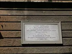 Plaque commemorating Saint Aloysius's stay in the building.