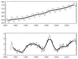 It is estimated that in 1997, peat and forest fires in Indonesia released between 0.81 and 2.57 gigatonnes (0.89 and 2.83 billion short tons; 0.80 and 2.53 billion long tons) of carbon; equivalent to 13–40 percent of the amount released by global fossil fuel burning, and greater than the carbon uptake of the world's biosphere. These fires may be responsible for the acceleration in the increase in carbon dioxide levels since 1998.[69][70] More than 100 peat fires in Kalimantan and East Sumatra have continued to burn since 1997; each year, these peat fires ignite new forest fires above the ground.