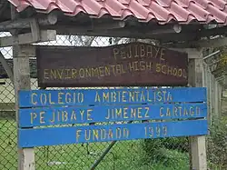 Pejivalle is known for having one of the first Environmental (or Ambiental) High Schools in Costa Rica called Colegio Ambientalista Pejivalle. Newly founded in 1999, this High School has a grand gymnasium, soccer field, air conditioned computer lab, and open air classrooms, with just under 300 students enrolled in grades 7 through 11. Students take classes to learn three languages (English, Spanish, and French) along with the basic core curriculum set forth by the Ministerio de Educación Pública (MEP) of Math, Science, Religion, Social Studies, among others, and a special course in Environmental Studies (also called Ambiental).[10] Nearly 50% of students complete their course work in this High School and go on to study in Universities throughout Costa Rica. In addition to the Environmental High School, there are 3 nearby Grade Schools in El Humo, Plaza Vieja and Pejivalle central with students in grades six and under.