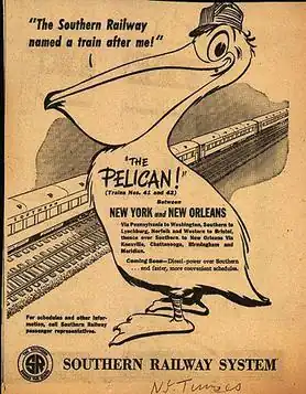 The Pelican was a named train of the Southern Railway which ran from New York City to New Orleans and back until 1970.