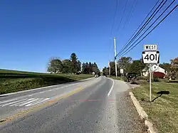 Pennsylvania Route 401 (PA 401) is a 20.2-mile-long (32.5 km) east–west state route in Berks and Chester counties, located in southeast Pennsylvania. The western terminus is at PA 23 in Caernarvon Township, across the county line from Elverson. The eastern terminus is at U.S. Route 30 (US 30) in East Whiteland Township, a short distance west of Malvern. PA 401 is called Conestoga Road its entire length and runs through rural areas with suburban development toward the eastern part of the route. PA 401 follows a former turnpike chartered in 1809 known as the Little Conestoga Turnpike. PA 401 was designated along Conestoga Road between PA 29 (Phoenixville Pike) and US 30/PA 1 in 1928. The route was extended west to PA 23 in the 1930s, at which time the entire length was paved.
