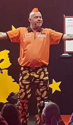 Wright was born in Livingston, Scotland, to a 16-year-old single mother; he has never met his father, who was in prison at the time of his birth.[5] When he was three years old, his mother moved to London with her son because she feared that her sisters would take him away from her.[6] Wright has lived in England since then but chooses to represent Scotland in sports. He first became interested in darts while watching players such as Cliff Lazerenko, Jocky Wilson, and Eric Bristow on TV in the early 1980s.[7] He received a set of darts for his 13th birthday, but since his mother could not afford a dartboard, he initially threw them at trees. After some practice, he was able to beat his stepfather and his stepfather's friends.[7] Within a few years, he was regarded as one of the most promising young players in London.[8]